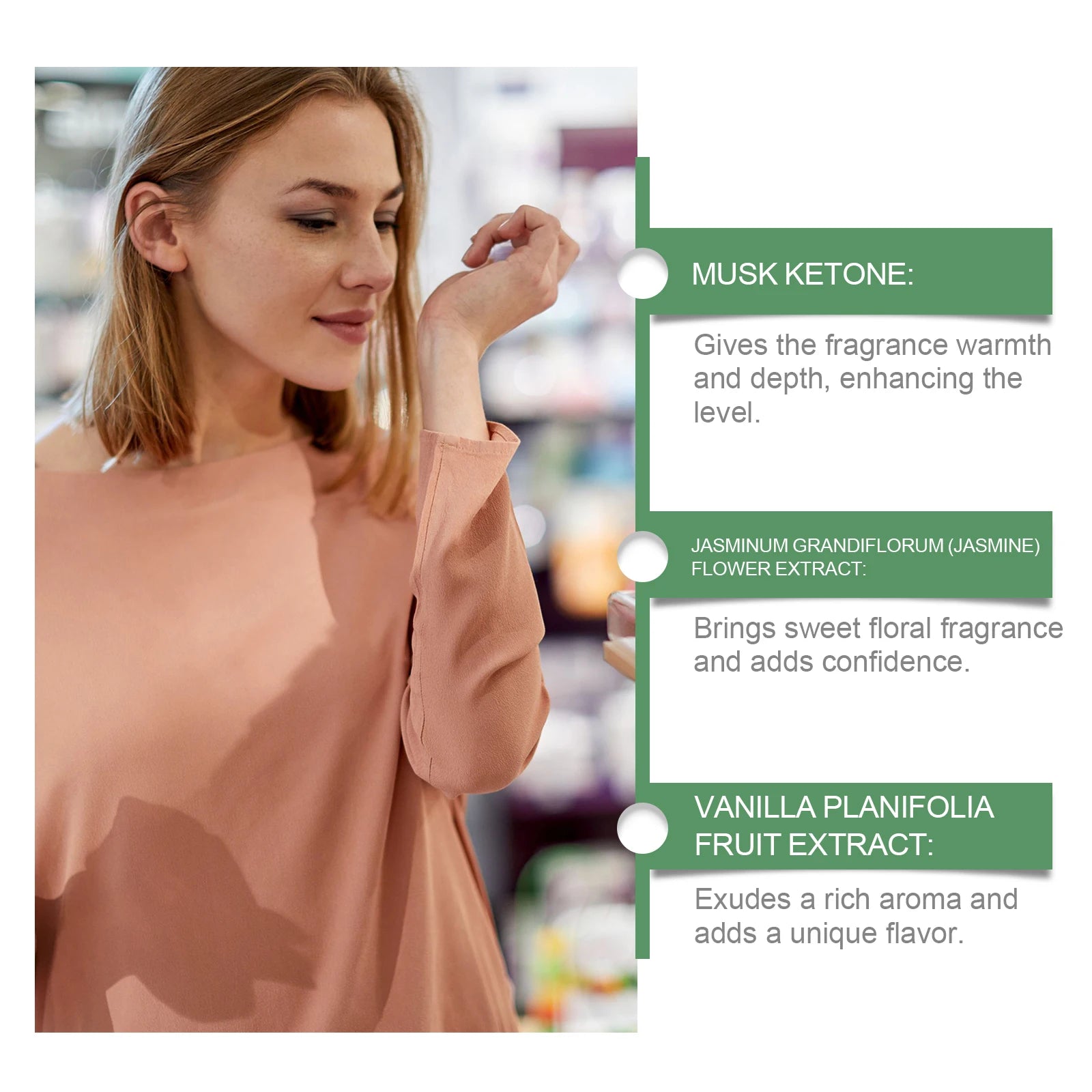 DIRECTIONS D'UTILISATION SÛRE :Roulez ce produit d'avant en arrière sur vos poignets, derrière vos oreilles, vos tempes, etc., et attendez 2 minutes pour que le parfum se dissipe complètement.